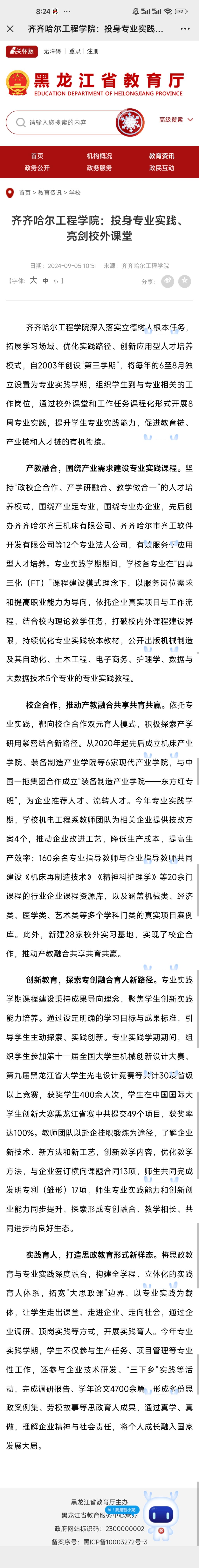 《黑龙江省教育厅》报道伟德bv1946官网:投身专业实践、亮剑校外课堂