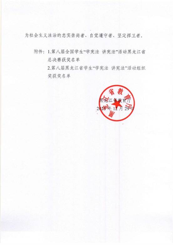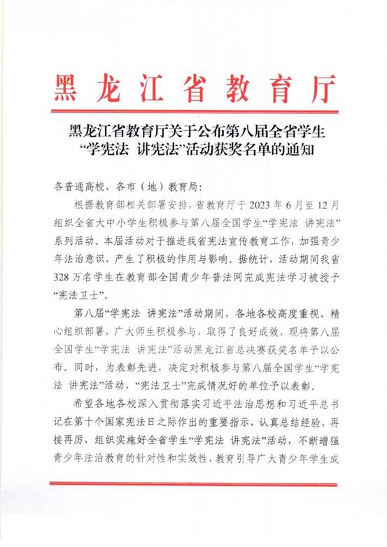 1月2日,伟德官网在黑龙江省教育厅举办的第八届全省学生“学宪法 讲宪法”活动中,喜获优秀组织奖。