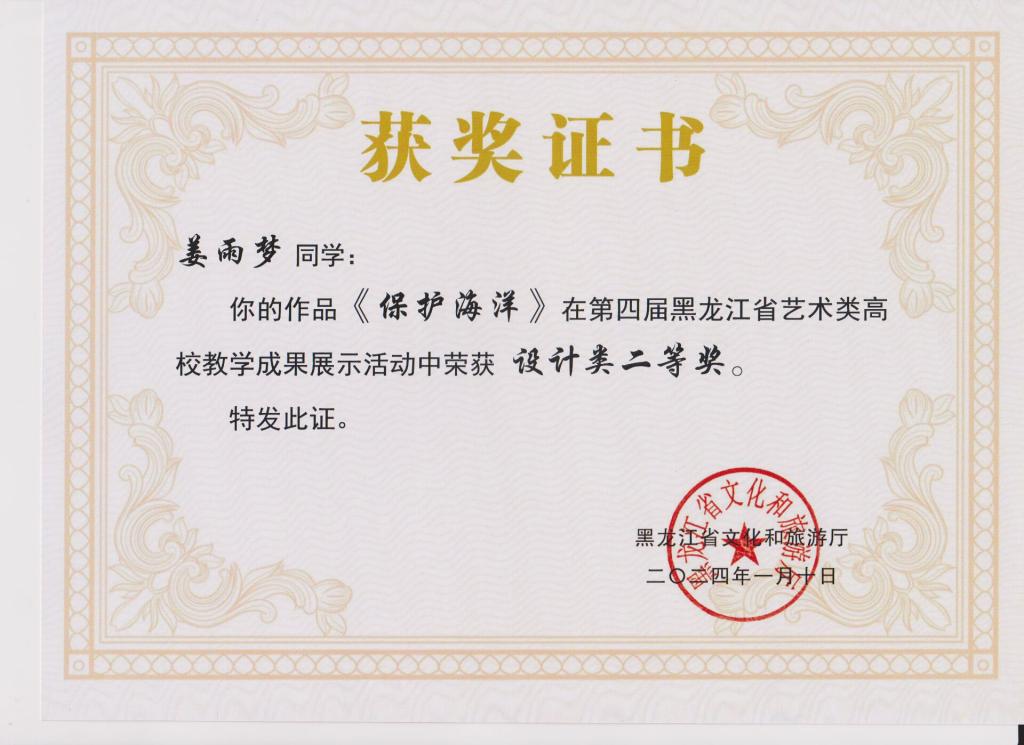3月12日,“第四届黑龙江省艺术类高校教学成果展示”竞赛传来喜讯,信息工程系视觉211班姜雨梦同学荣获“第四届黑龙江省艺术类高校教学成果展示活动”设计类二等奖,张振兴老师荣获指导教师二等奖。
