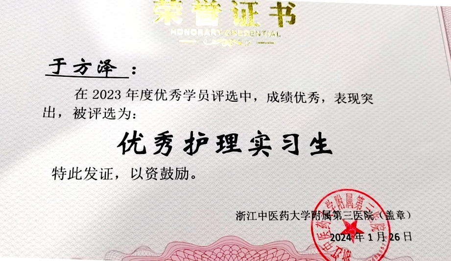 在浙江中医药大学附属第三医院实习的护理学206班于方泽同学荣获“优秀护理实习生”荣誉称号。