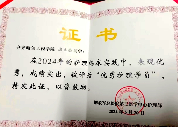 在中国人民解放军总医院第三医学中心实习的护理学205班王萌萌、202班谯立志、203班张淑欣三名学生荣获“优秀护理学员”荣誉称号;护理学202班谯立志、204班葛世华、203班周雯慧和张淑欣四名学生被该医院录用。