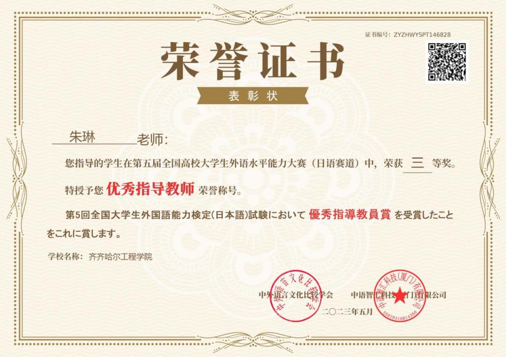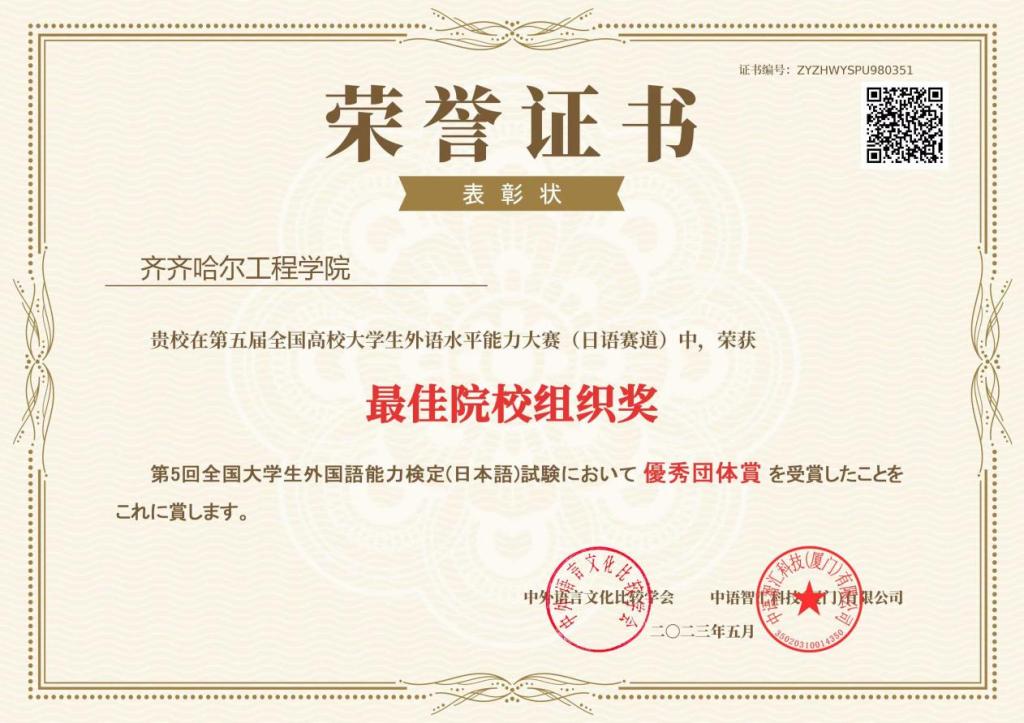 近日,由中外语言文化比较学会主办、中语智汇科技(厦门)有限公司承办的“第五届全国高校大学生外语水平能力大赛”全国总决赛落下帷幕。伟德官网张燕、唐章磊、韩卉桐等6名学生在日语赛道比赛中获得国家级三等奖。学校被授予“最佳院校组织奖”称号,指导教师朱琳被授予“优秀指导教师”荣誉称号。