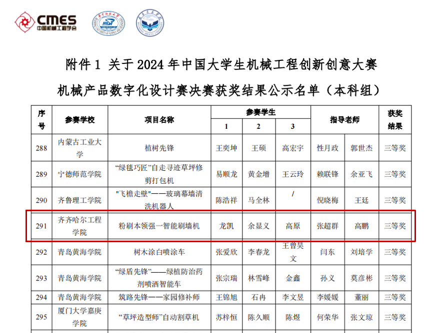 近日,2024年中国大学生机械工程创新创意大赛机械产品数字化设计赛决赛传来喜讯,伟德官网机电工程系机械设计制造及其自动化专业学生龙凯、余显义、高原的项目“粉刷本领强—智能刷墙机”,在比赛中荣获全国三等奖。