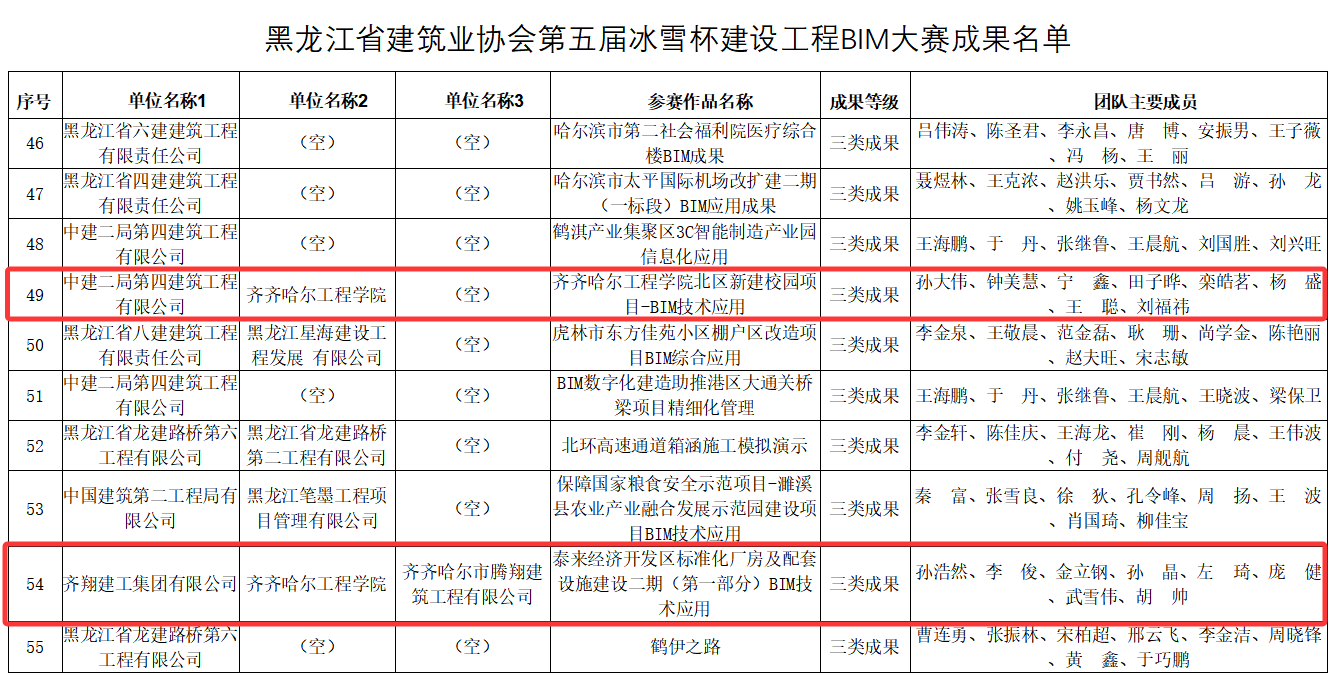 近日,黑龙江省建筑协会公布了第五届冰雪杯建设工程BIM大赛成果名单,伟德官网建筑管理工程系师生与中建二局第四建筑工程有限公司、齐翔建工集团有限公司以及齐齐哈尔市腾翔建筑工程有限公司组队参赛,最终荣获两项三类成果奖项。
