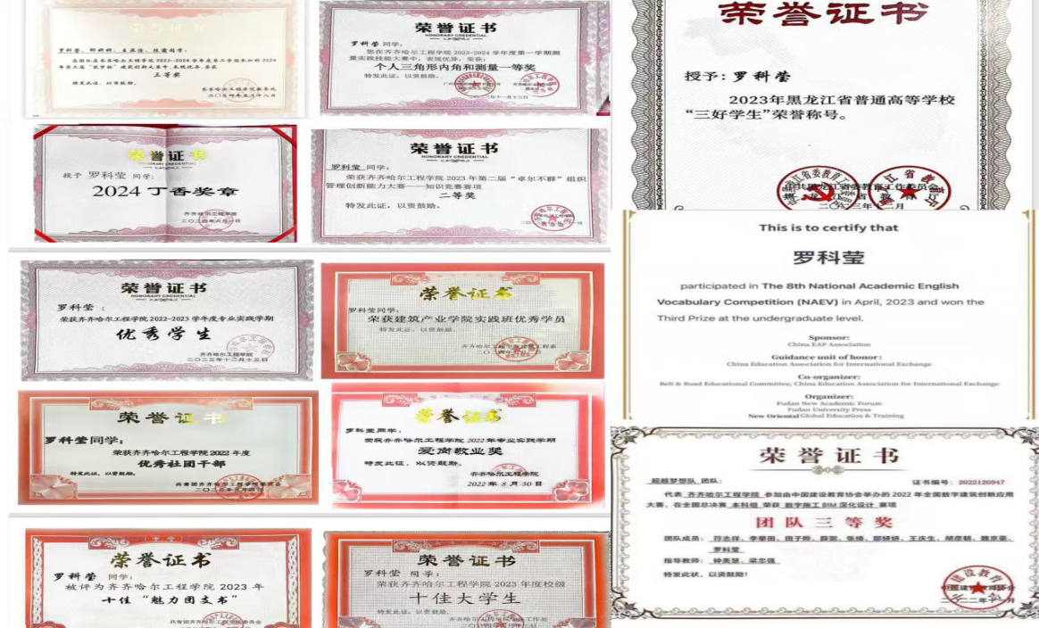 在专业实践方面,她深知当代社会对于高素质、高水平复合型人才的迫切需要,作为土木学子,更要注重实践、提升技能。课余时间,她利用中国大学慕课、我要自学网、广联达等各大学习平台,自学与专业相关的软件操作,努力提升专业能力和技术水平。为将学到的知识运用到实践中,她积极参加校内各种技能比赛以及兴趣小组,做到理论与实践相结合,巩固专业理论知识,增强动手能力,并荣获“卓尔不群”组织管理创新能力大赛“二等奖”、测量实践技能大赛“个人三角形内角和测量”一等奖、2024年“筑梦杯”大学生建筑创新大赛“三等奖”等称号。