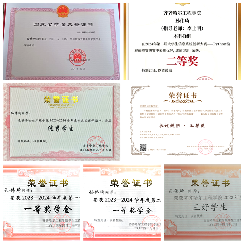孙伟琦以持续专业第一名的成绩先后获得国家奖学金、二次一等奖学金。同时,获得第二届大学生信息系统创新大赛——Python编程巅峰赛决赛二等奖。他积极主动帮助同学,参与“班级答疑”、开展“寝室帮扶”等活动、组织“学风建设会”,并成立了学习小组。通过这些活动,不仅提高了他的综合素质和学习成绩,也帮助周围的同学共同进步。