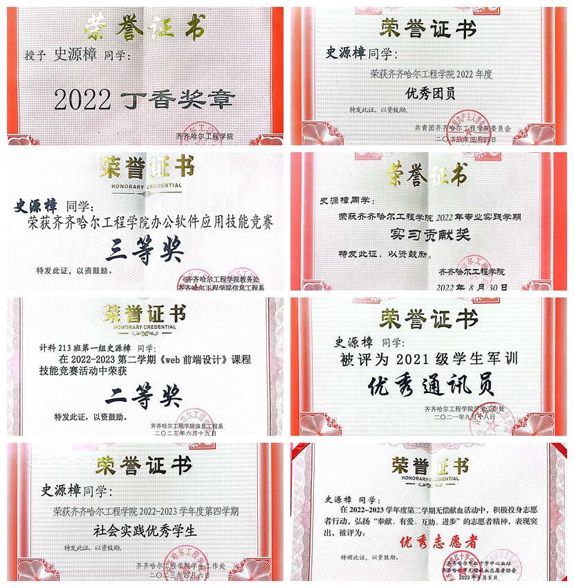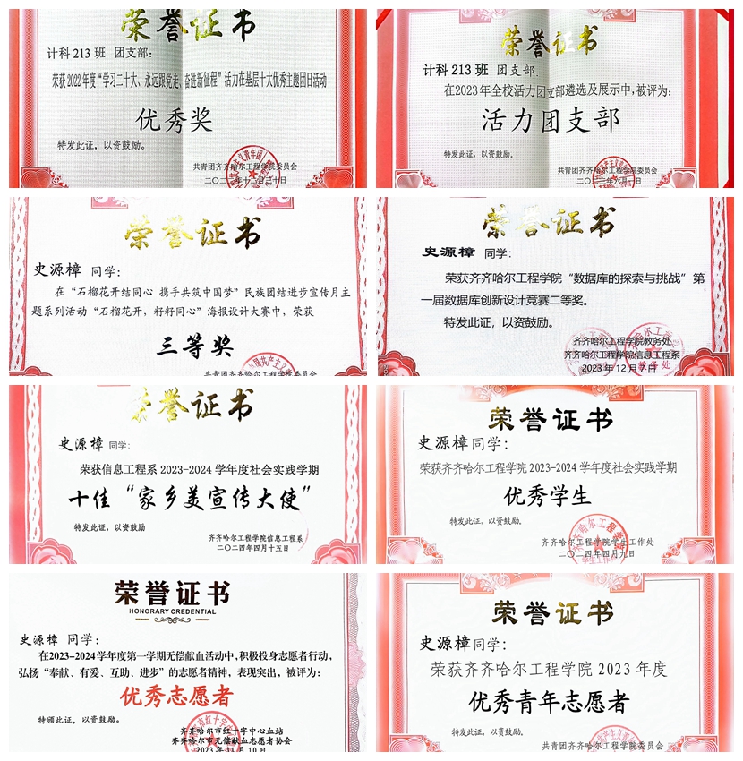 史源樟,女,信息工程系计算机科学与技术专业学生,国家励志奖学金获得者、黑龙江省三好学生、齐齐哈尔市优秀共青团员,多次获得校级奖学金。在“伟德bv1946官网办公软件应用技能竞赛”中荣获三等奖,获得“学习党的二十大、永远跟党走、奋进新征程、活力在基层”十大优秀主题团日活动组织策划奖,史源樟多次组织并参与团学活动,充分展现新时代青年全面发展的良好风貌。