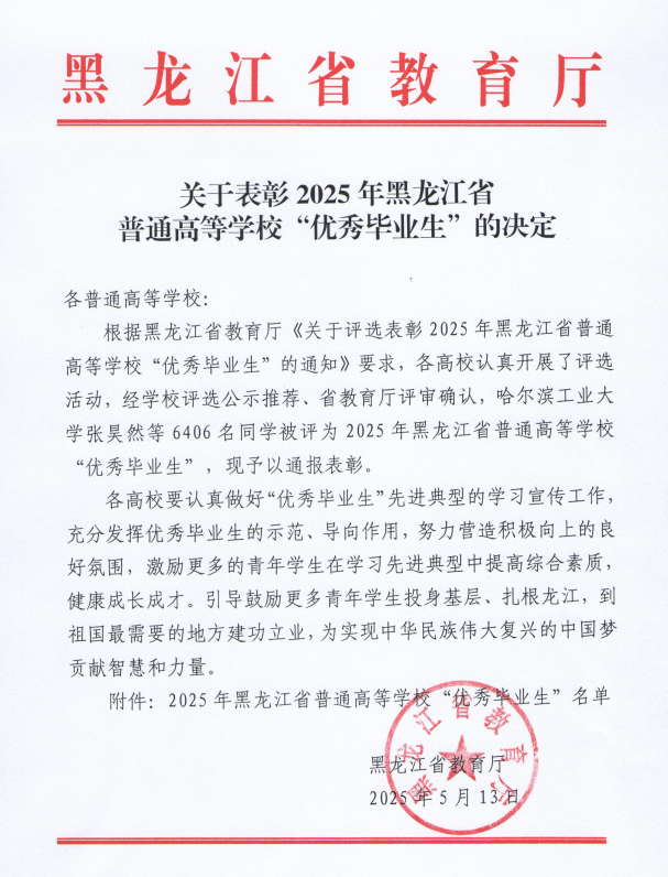 近日,黑龙江省教育厅公布获得黑龙江省普通高等学校省级优秀毕业生名单。伟德官网机电学院李浩男、土木与管理学院刘洋、信息学院赵洪宇、医学院翁雨诺等47名学生获得2025年黑龙江省普通高等学校“优秀毕业生”荣誉称号。
