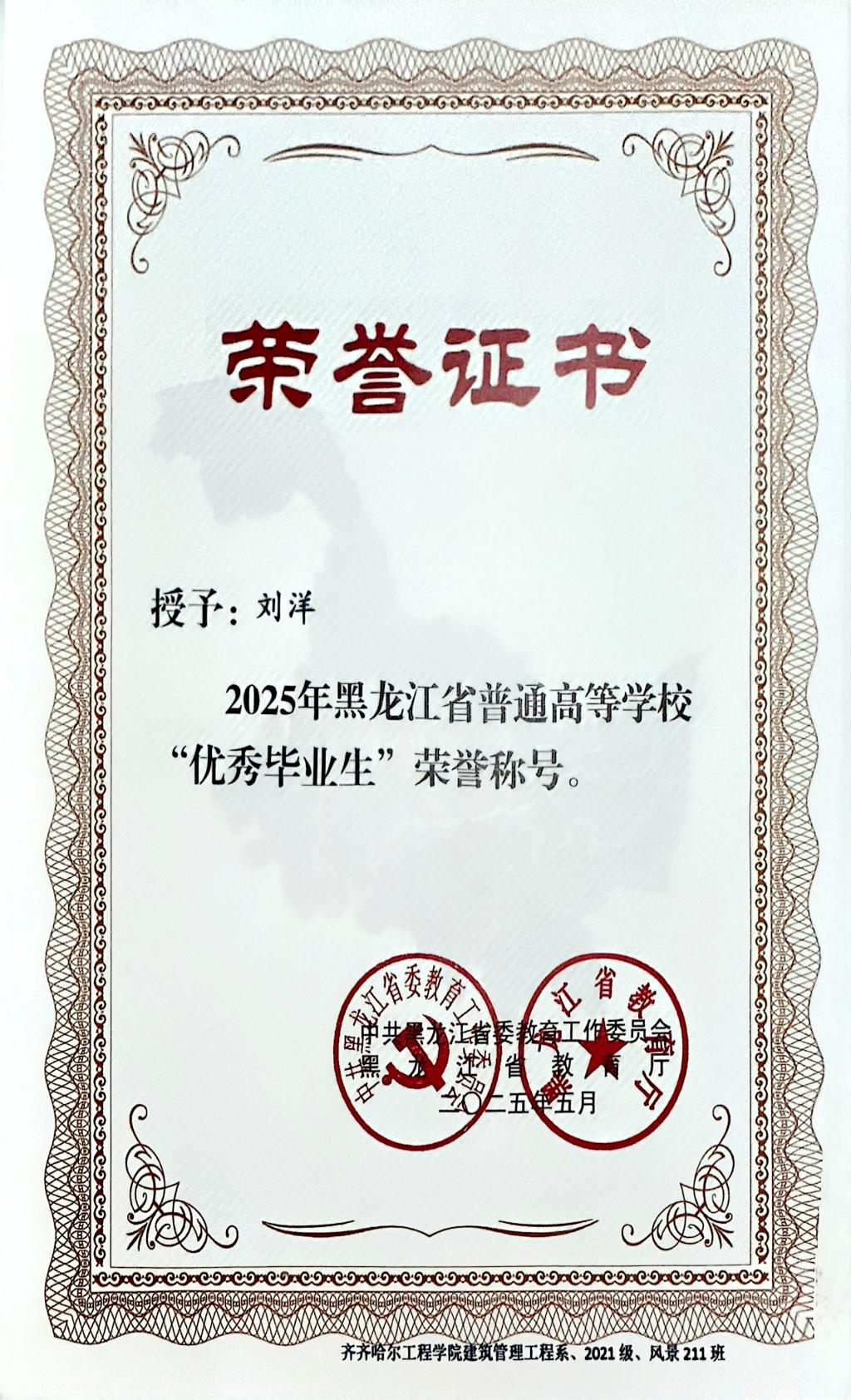 刘洋,土木与管理学院2025届风景园林专业毕业生,获评黑龙江省优秀毕业生。在校期间,荣获国家奖学金、黑龙江省三好学生等荣誉,多次获得校级奖学金,并被学校评为优秀学生干部、三好学生、青年大学习先进个人、社会实践学期优秀学生。