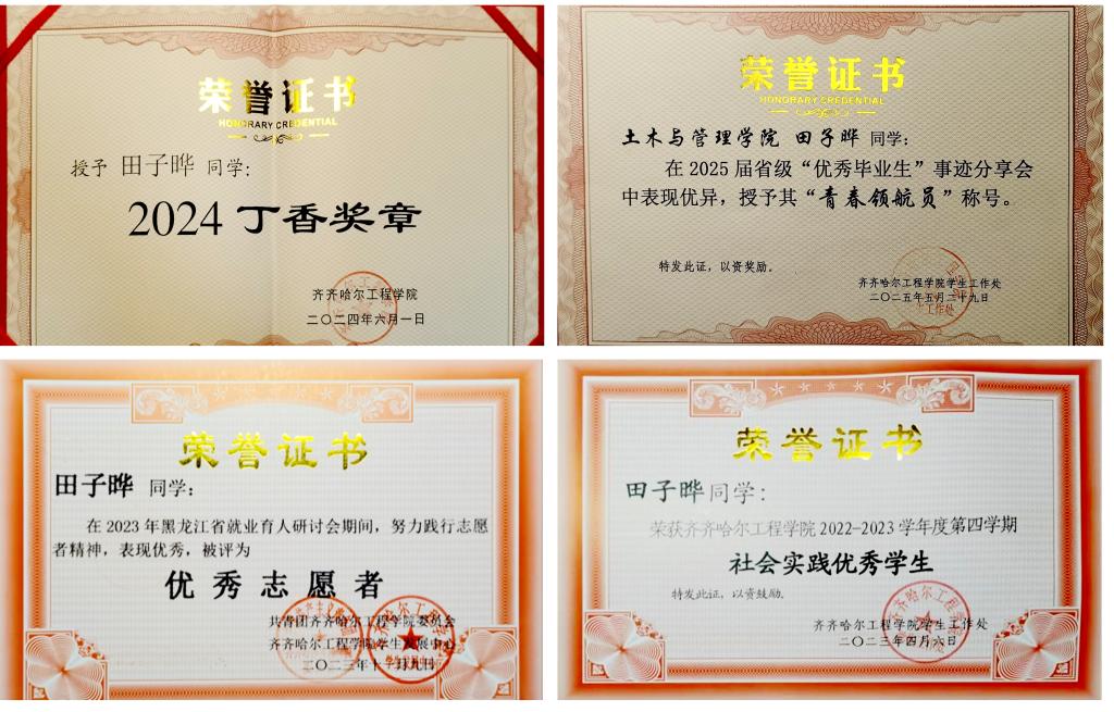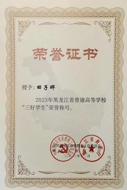 在校期间,田子晔始终以高度的热情和专注投入在学习中。课堂上,他紧跟老师的讲解,不放过任何一个知识要点。课后认真复习,凭借刻苦与执着,他的学业成绩在班级里名列前茅,获得学校一等奖学金三次、二等奖学金四次,2024年度丁香学子、2022年度三好学生。这些荣誉不仅是对他努力学习的肯定,更是激励他不断前行的动力。