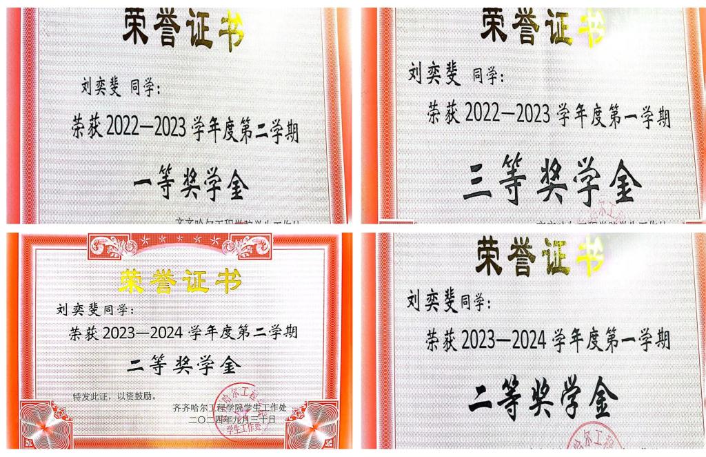 刘奕斐积极拓展科研视野,勇于挑战自我,参与多项国家级、省级及校级创新创业项目成果显著,获2024年全国大学生创新创业能力大赛初赛创新思维大赛获一等奖、“第四届全国大学生职业发展大赛”初赛获一等奖、2025年第二届中华优秀传统文化知识大会获一等奖等荣誉,展现了过硬的实践与创新能力。
