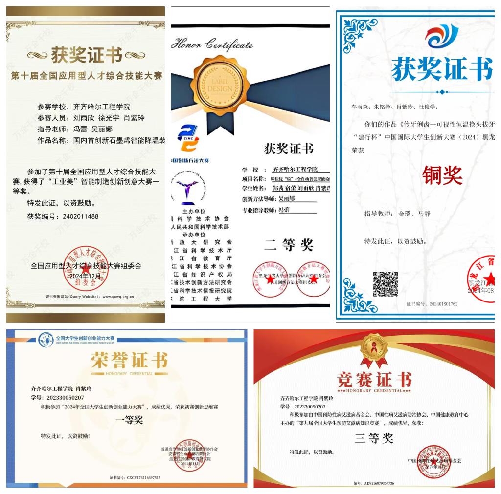 肖紫玲勇于挑战自我,积极参加各类竞赛,在第十届全国应用型人才综合技能大赛获一等奖、“建行杯”中国国际大学生创新创业大赛(2024)获铜奖 、中国创新方法大赛获二等奖。