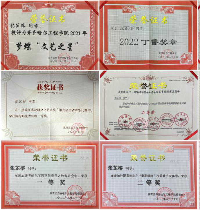 张芷榕在校期间担任大学生艺术团团长与班级档案员,她秉持认真严谨的工作作风,以饱满的热情投入各项工作。凭借优秀的组织能力,她带领团队成功策划并举办多场精彩的文艺汇演,同时,高效地完成档案管理工作。先后荣获“美育浸润行・绚丽年华” 第十七届全国美育教学成果展评学生组二等奖、黑龙江省“北疆文化艺术奖” 第九届全省声乐比赛二等奖,校级“丁香学子”和“优秀班级档案员等多项荣誉。