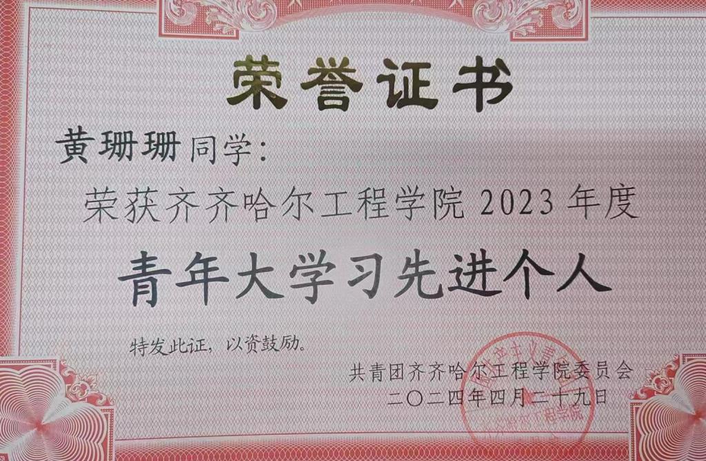 黄珊珊在思想上始终保持积极进取的态度,她深知理论学习的重要性,不仅认真参加思想教育活动,还主动通过多种渠道加强理论学习,不断提升自身的思想修养。在生活中,她更以实际行动发挥带头作用,积极带动身边同学共同进步,并荣获伟德bv1946官网 2023 年度“青年大学习先进个人”称号。