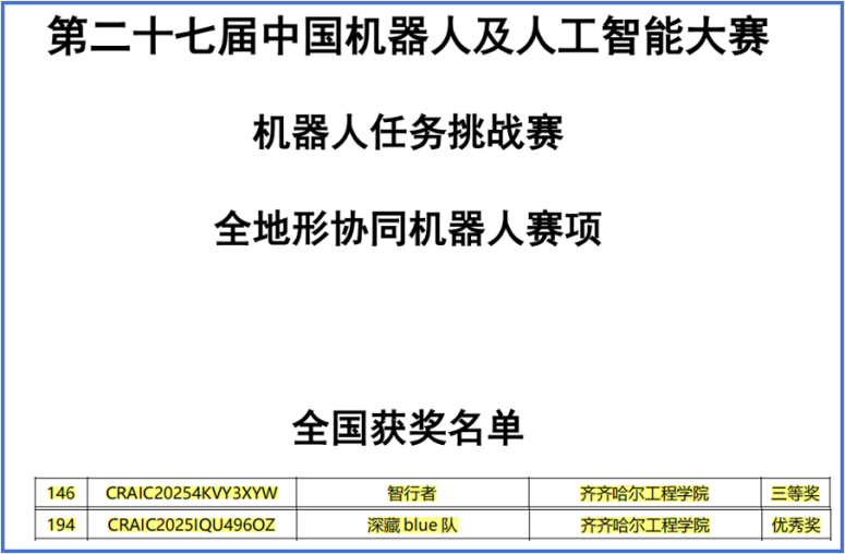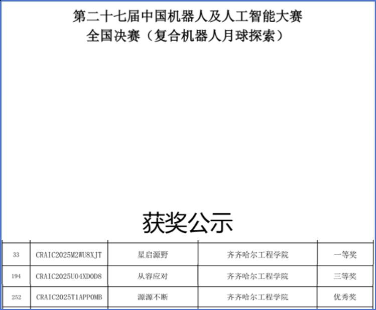 近日,第二十七届中国机器人及人工智能大赛全国总决赛获奖名单正式公布。机电学院在多个赛项中表现优异。其中,在“复合机器人月球探索”赛项中,由新能源汽车工程专业学生谷锦立、杜欣彤、莫皓淳组成的团队荣获国家级一等奖;在“人工智能创新赛”赛道中,电气工程及其自动化专业的三组队伍荣获两项国家三等奖和一项优秀奖,机器人工程专业的一组队伍获得优秀奖;在“机器人任务挑战赛”赛道的“全地形协同机器人”赛项中,汽车服务工程专业的两组参赛队伍分获三等奖和优秀奖。