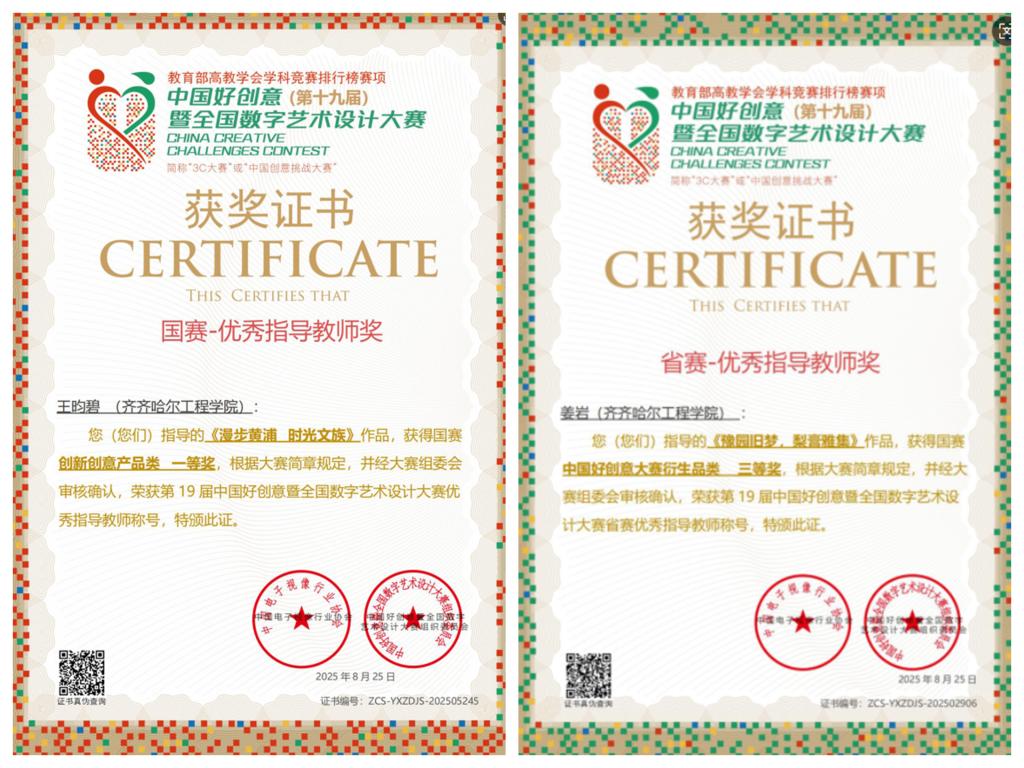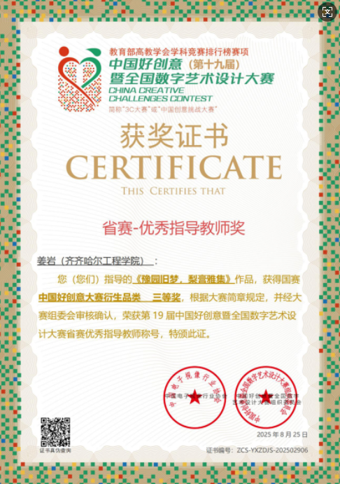 8月25日上午,中国好创意(第十九届)暨全国数字艺术大赛传来捷报,伟德官网信息学院视觉传达设计专业凭借扎实的专业实力脱颖而出,不仅一举斩获该专业首个国家级 A 类赛事设计类一等奖,实现历史性突破;同时还收获国家级三等奖 1 项、省级二等奖 2 项、省级三等奖 1 项,奖项覆盖国赛与省赛多个层级,成绩亮眼。同时,该专业教师团队同步获誉:专业长姜岩老师荣获国赛优秀指导教师奖,专业助理王昀碧老师荣获省赛优秀指导教师奖,师生同频发力。