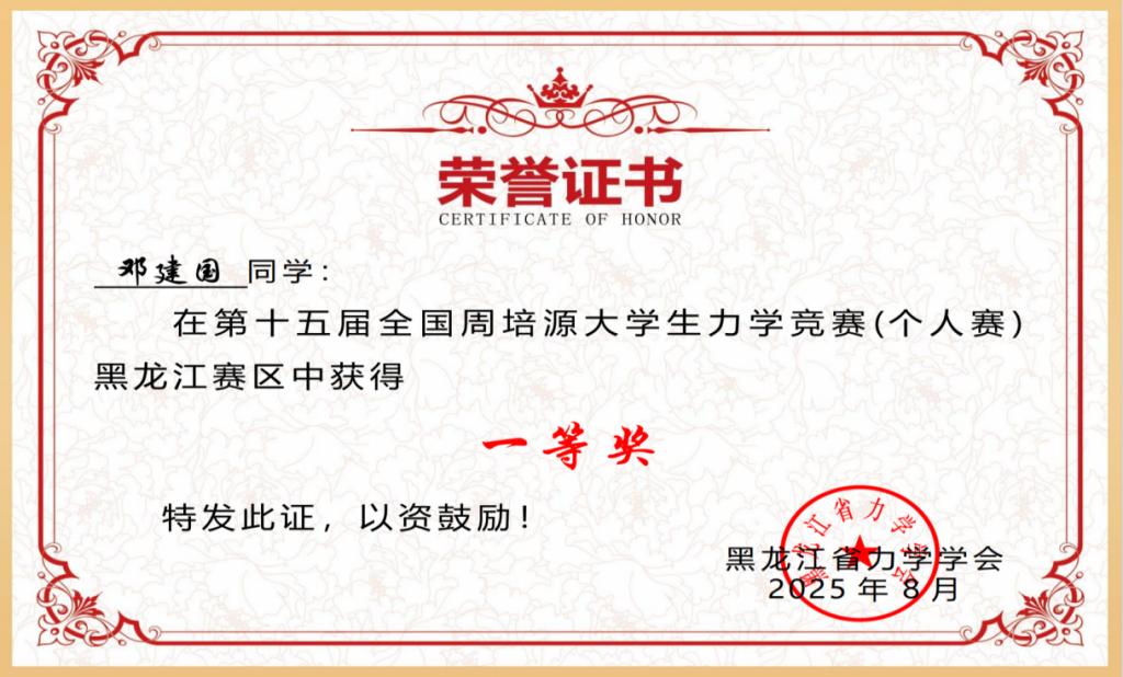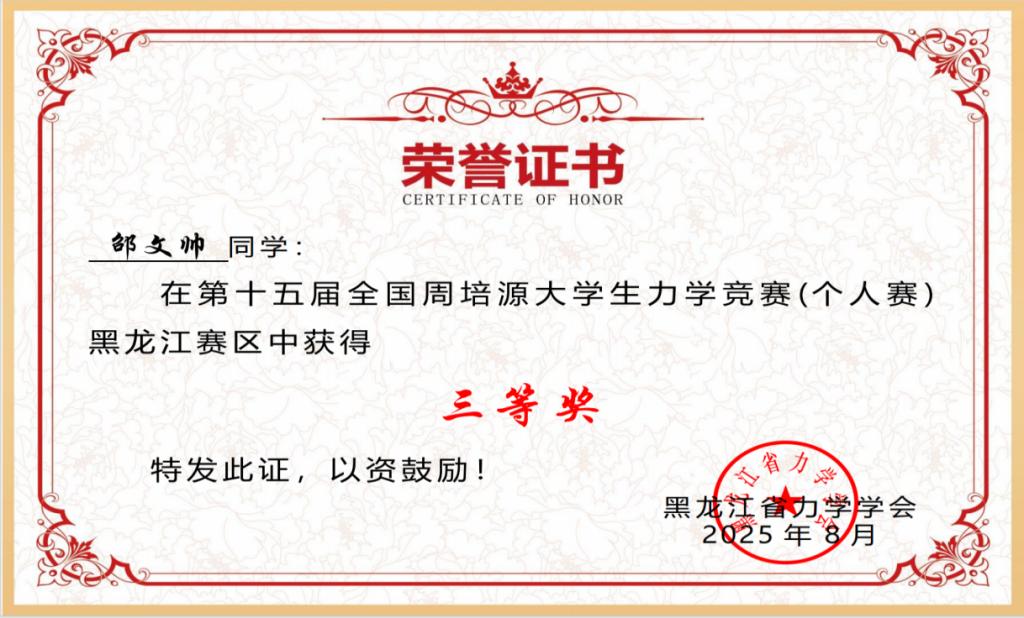 近日,第十五届全国大学生周培源力学竞赛黑龙江赛区评选结果正式揭晓,伟德官网土木与管理学院土木工程专业邓建国同学凭借扎实的力学理论基础与出色的实践应用能力,荣获黑龙江赛区一等奖;同专业邵文帅、吴佳乐两位同学亦表现亮眼,双双斩获黑龙江赛区三等奖。这是伟德官网首次组队参加该项赛事,并取得了优异的成绩。