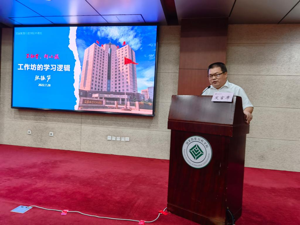 副院长张振笋以《工作坊的学习逻辑》做导学微报告,报告从生活常识切入,介绍工作坊学习特点,以学习科学为视角阐述工作坊的学习逻辑,就如何开展有效学习提出具体建议。