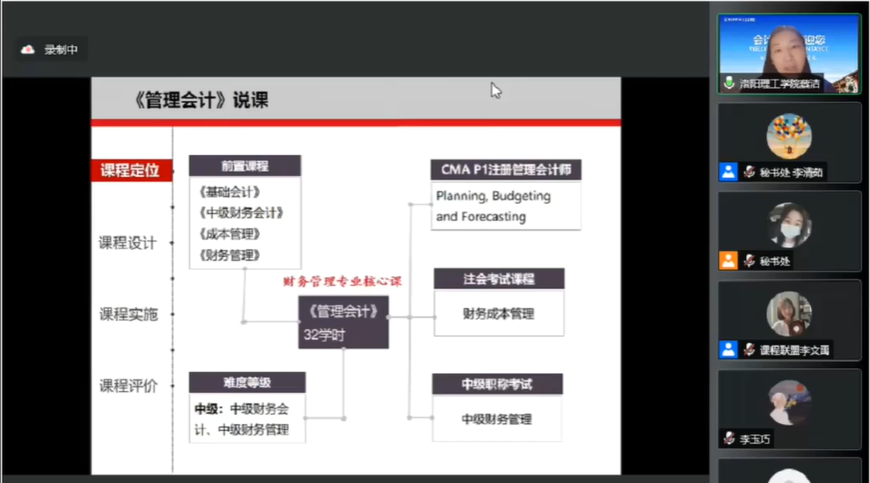 学员、洛阳理工学院会计学院蔡洁副院长分享《管理会计》课程开发,蔡院长根据四真三化的原则和方法,围绕应用型课程开发四要素进行了说课展示。蔡院长表示通过对专业培养目标、毕业要求、门课、项目/章节、课点的学习,进一步了解了三级矩阵的关系,通过课点的重新组合打开了思路,建立课程思政三级矩阵,设计延伸课堂等。
