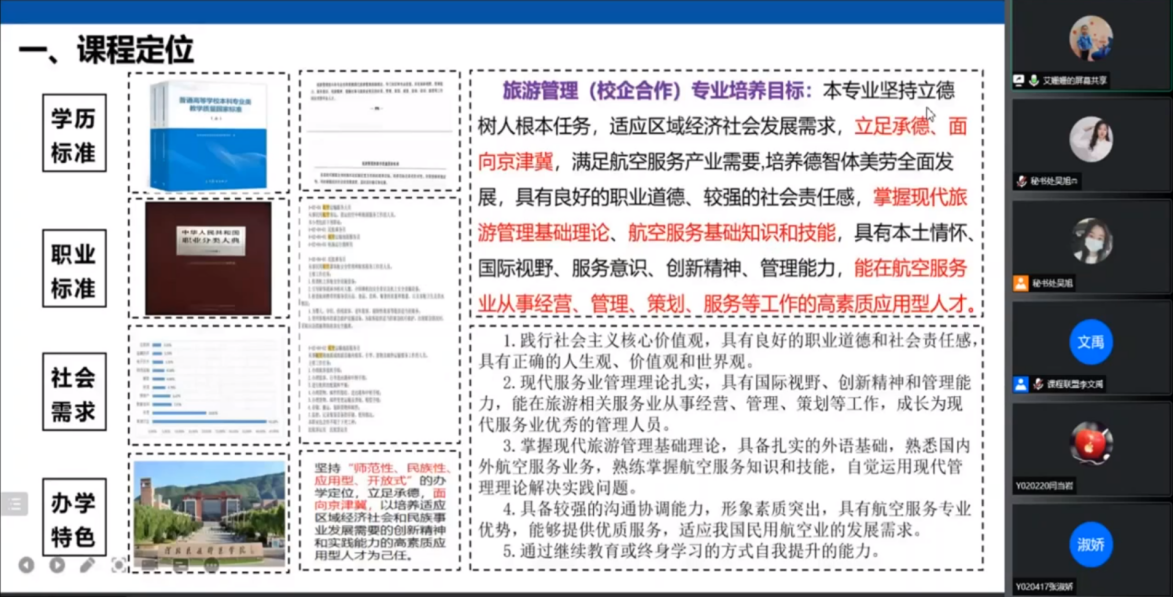 河北民族师范学院艾姗姗老师分享了《民航服务英语》课程开发,围绕课程四要素展开。通过确立旅游管理(校企合作)专业的人才培养目标进而析出了该专业的毕业要求,梳理出了5大项目及32个课点;通过制作航前工作的工作流程图等项目进行课程实施,并给予明确的评价标准,保证了课程项目的评价是可测量的、可追溯的,也为进一步反推课程教学目标及毕业要求指标点达成提供了可靠的数据支持。