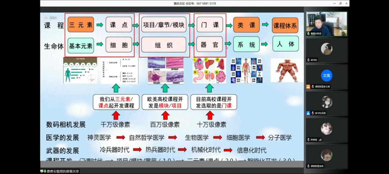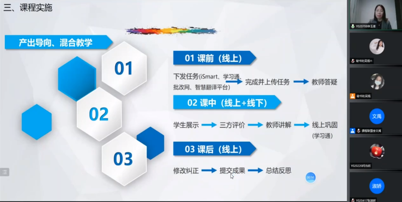 邢台学院申玉革老师分享了《高级英语》课程开发,从课程四要素出发,分享了三级矩阵的编制过程。申老师表示通过培训改变了其从教材出发的教学理念,重新认识每一级教学目标的达成都需要课点的严格支撑,从而去靶向教学目标的达成。