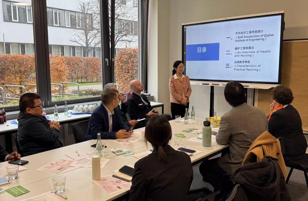 11月25日,考察团成员抵达德国海尔布隆应用技术大学,该校Alex教授与考察团成员围绕数字化转型与未来人才能力模型和德国应用科学大学专业设置、培养模式与发展趋势等内容开展了深入的研讨。研讨会上,伟德官网康护工程系主任郭玲玲向德方专家介绍了“四真三化”(FT)课程建设原理与方法, Alex教授表示十分赞赏,双方就如何构建课程质量保障体系等问题进行了深入探讨。