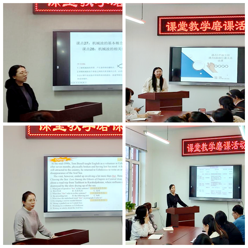 本次磨课活动,流程严谨规范。先是每位教师进行深入的个人教学设计打磨,之后经由各教研室严格初选,推荐出 4 位优秀教师参与部门层面的磨课展示。分别是数学教研室王楠、大学语文教研室于丽媛、大外教研室徐怡以及物理教研室卓春蕊。在磨课展示环节,四位教师各展所长,分别聚焦学生活动、数智化教学手段运用、高阶课堂教学设计以及思政元素巧妙融入等重点内容展开汇报。