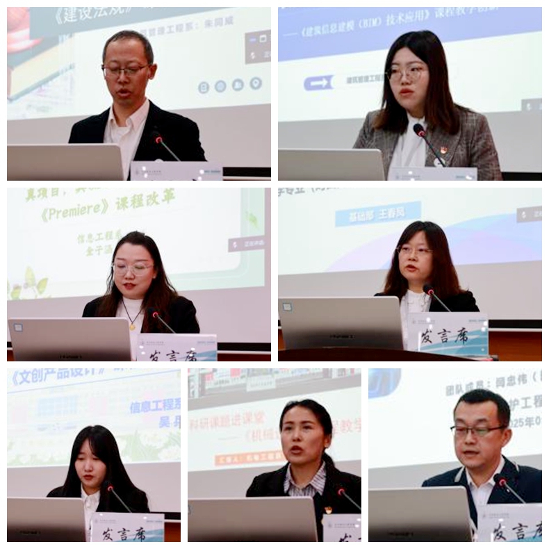经部门初审及教务处组织的三轮评审,共有7门课程进入现场评比环节。在评比中,参赛教师们展示了他们在课程改革中的创新做法和优秀成果,7位教师围绕产教融合、数智化建设、教学方法和手段创新等核心创新点,详细介绍了各自课程的特色与亮点。这些课程均坚持以学生为中心的教育理念,特色鲜明,成效斐然。