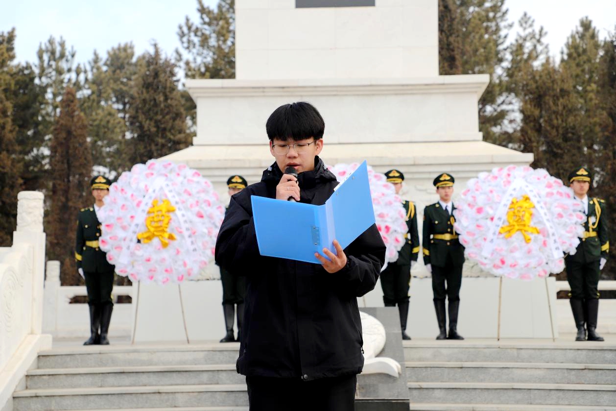 学生代表机械221班孙显浩发言,表示作为学生干部要继承先烈遗志,努力学习,积极进取,为实现人生价值和祖国的繁荣富强而努力奋斗。