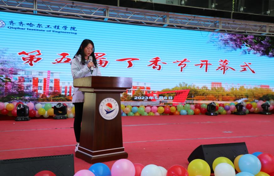 团委李红老师宣读《关于开展第五届丁香节活动的通知》,第五届丁香节历时一个月,将通过开展“唱丁香”“画丁香”“舞丁香”“寻找丁香学子”等系列活动,倡导丁香精神,培养丁香品质。
