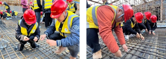 目前我系学生已经实际参与到伟德官网校园北区建设项目地下室底板防水—模板安装—钢筋绑扎—混凝土浇筑等一系列施工工艺、工序中。如徐喜辉老师所授的《土木工程施工技术与组织》课程,徐老师将北区校园现场作为“教室”,将知识点、技能点和态度点融入到每一个工序之中,学生亲自动手,完成钢筋的绑扎工作,更深入地理解梁、板施工工艺。