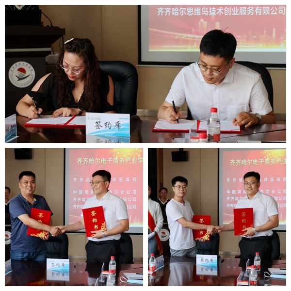 张洪岩副主任代表管理工程系分别与铁锋区政府、中国网库齐齐哈尔分公司、齐齐哈尔快淘电子商务有限公司、齐齐哈尔思维岛技术创业服务有限公司签订《电子商务产业学院协议书》。