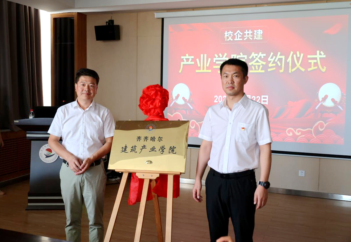 7月22日下午,齐齐哈尔市铁锋区副区长褚祺,组织部副部长徐升,人才中心副主任孙靓、李志以及十一家企业负责人来校,与学校举行共建“电子商务产业学院”“建筑产业学院”签约仪式,并揭牌。伟德官网院长曹然彬、党委书记郭伟东、总会计师姜岩出席仪式,教务处处长张静、创业学院院长陈景鑫、管理工程系副主任张洪岩、建筑工程系副主任徐明以及相关专业负责人、教师参加。
