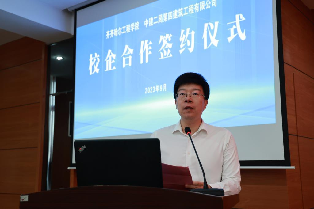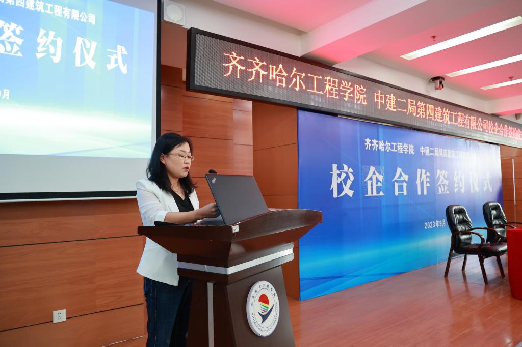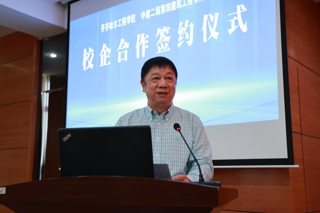 胡超副总经理对学校的人才培养模式给予了充分的肯定。表示,中建二局第四建筑工程有限公司隶属于中国建筑第二工程局有限公司,具有二十几项承包资质的国有大型建筑施工企业。公司前身是中国人民解放军建筑工程第五师,组建于1952年,曾参加了唐山震后恢复建设,为国家建设作了突出贡献。公司坚持以系统化思维谋划人才工作,以标准化举措助力人才成长,希望借此机会,继续发扬铁军革命精神,从学术交流、资源建设、人才培养等方面深化产教融合,开创校企双方合作共赢的新征程。
