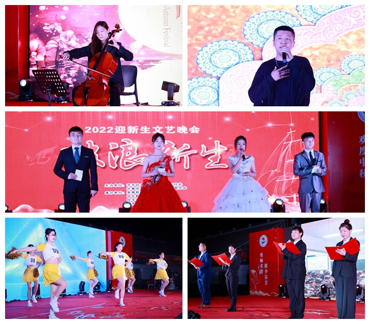 迎新晚会在教师杨力威、陈鑫然老师演奏的大提琴《月亮代表我的心》和《Moon River》中拉开了帷幕,数百条彩色烟雾依次升空,如鲜花般迎风绽放。