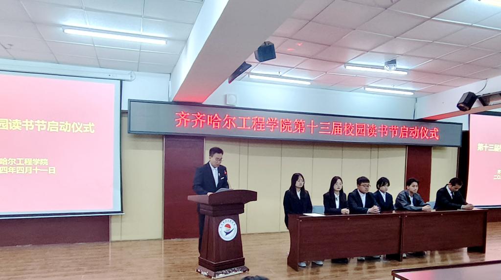 启动仪式上,靳鹏以《书香洒校园 阅读点亮梦想》为题致辞,刘禹彤宣读本届读书节活动方案。