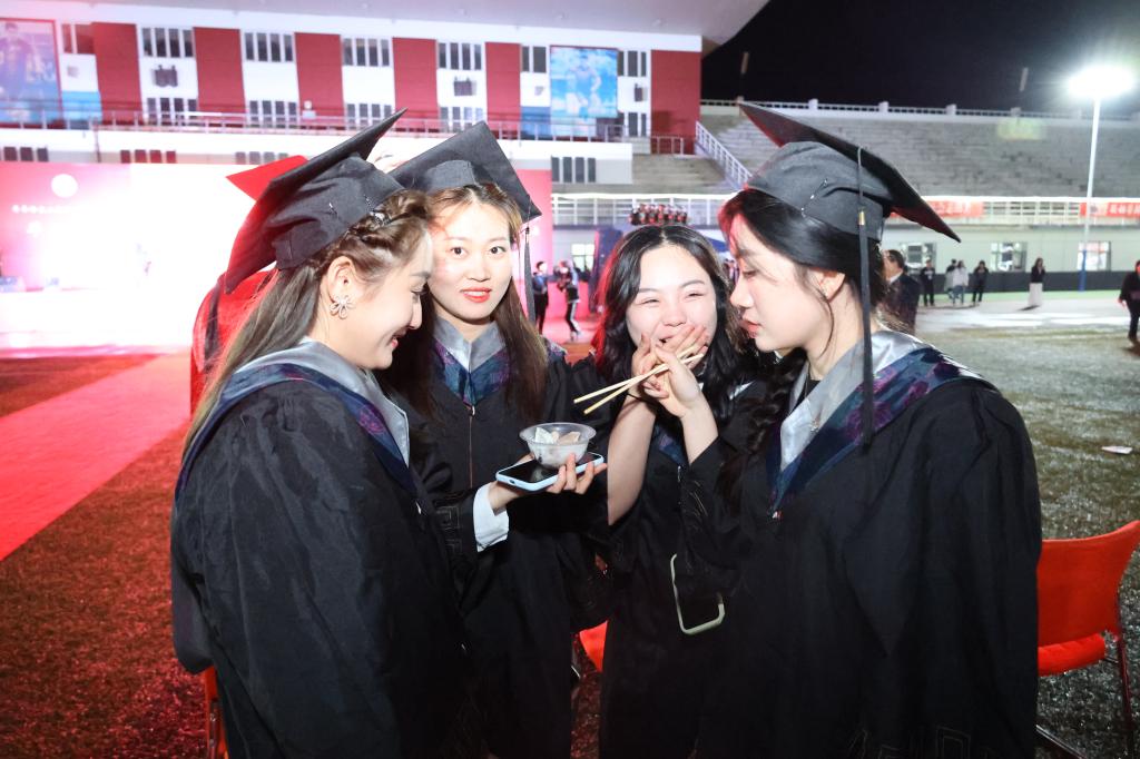 “上饺子喽”,伴随欢快的音乐,一碗碗包含着学弟学妹浓浓的祝福的热气腾腾的饺子送到在场每一位毕业生手里,夜空里礼花绽放,映照着每一张幸福的笑脸。