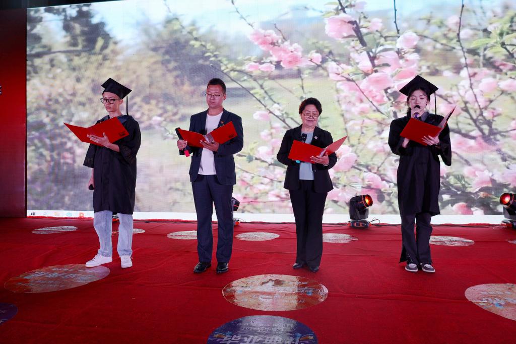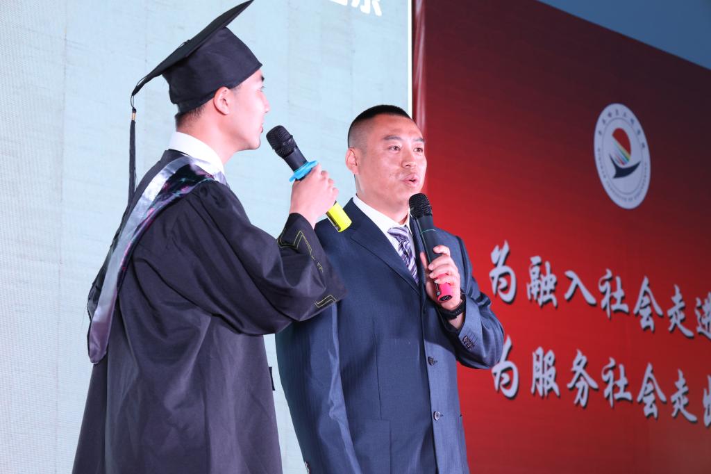 在祝福篇章中,师生代表朗诵《易湖礼赞》,以易湖为视角,回顾学校创业31年历程,阐述学校办学理念,表达毕业生对母校的依依不舍之情。辅导员王丽伟老师和英语181班毕业生裴爽的暖心对话让人难以忘怀,公寓辅导员多晓辉老师与计科181毕业生辛兴的临别对话令全场潸然泪下。