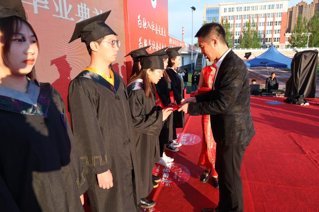 党委书记郭伟东为优秀毕业生获奖代表颁发荣誉证书。
