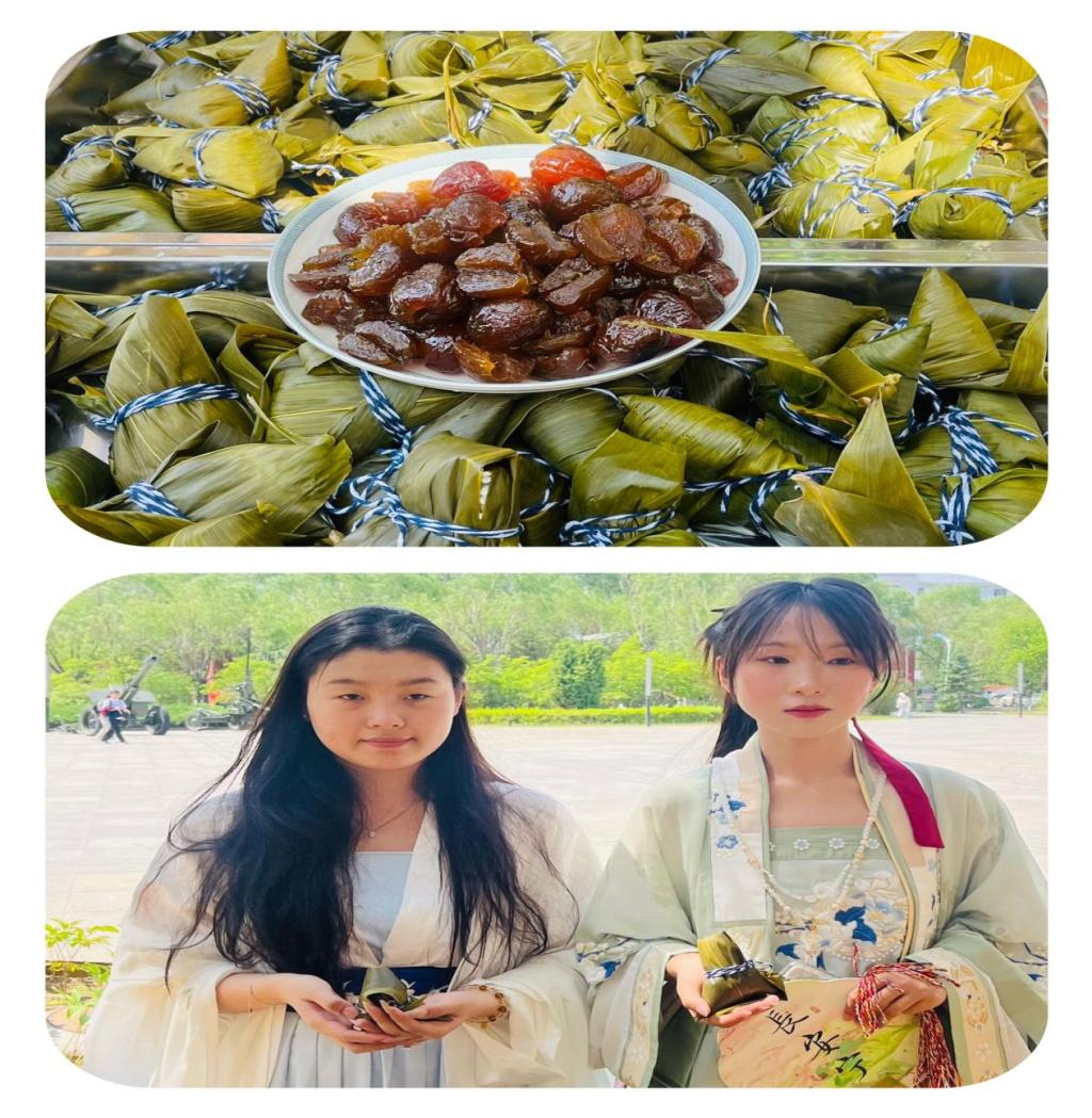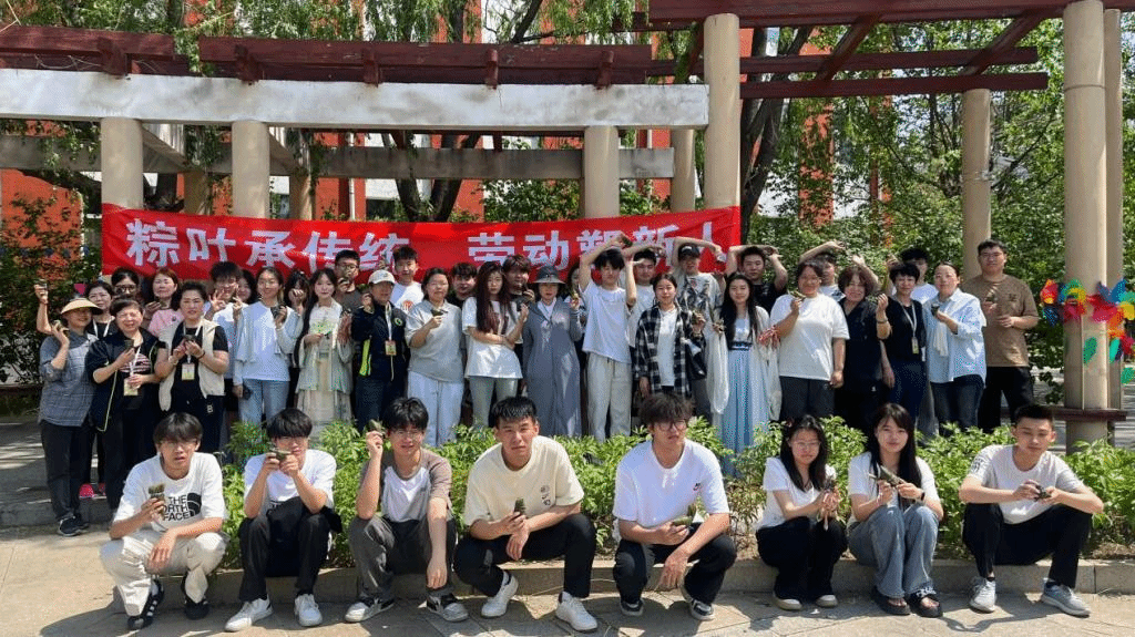 随后,同学们纷纷动手体验包粽子的乐趣,巧手翻飞间,翠绿的粽叶被折成精巧的漏斗状,填入晶莹的糯米与甘甜的蜜枣,再用粽绳细细缠绕捆扎。虽然新手们包出的粽子形态憨态可掬、各具特色,但欢声笑语中洋溢着浓浓的节日氛围,现场其乐融融。