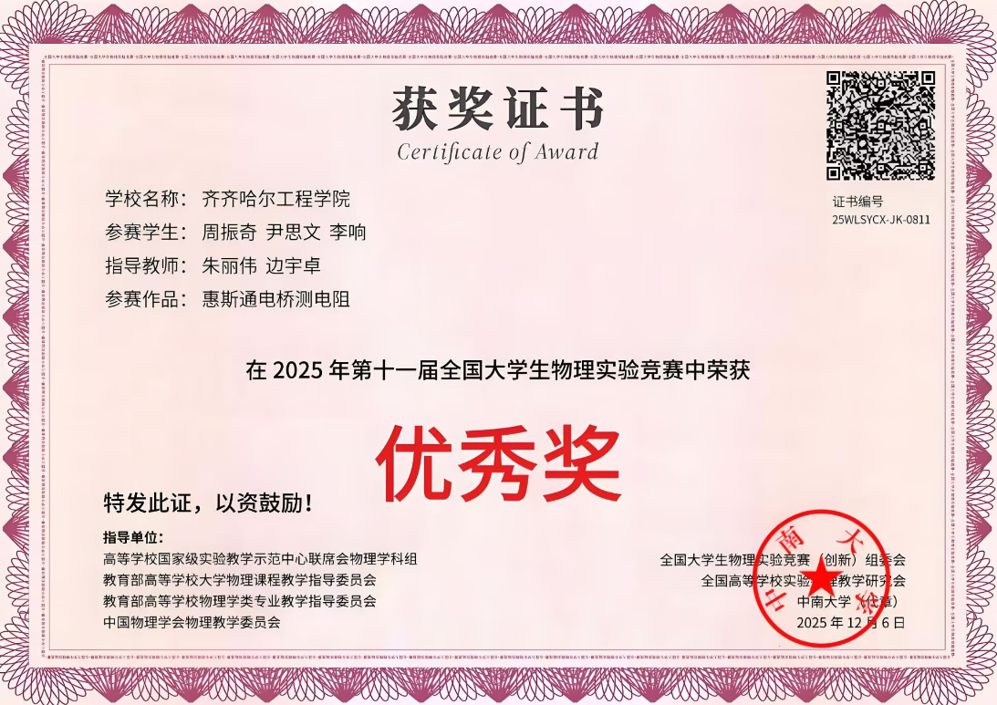 此次佳绩不仅是对参赛同学辛勤付出的肯定,也充分体现了物理教研室“以赛促教、以赛促学”的教学成效。未来,物理教研室将继续深化物理实验教学改革,依托学科竞赛平台,进一步提升学生创新实践能力,为培养高素质创新型人才奠定更坚实的基础。