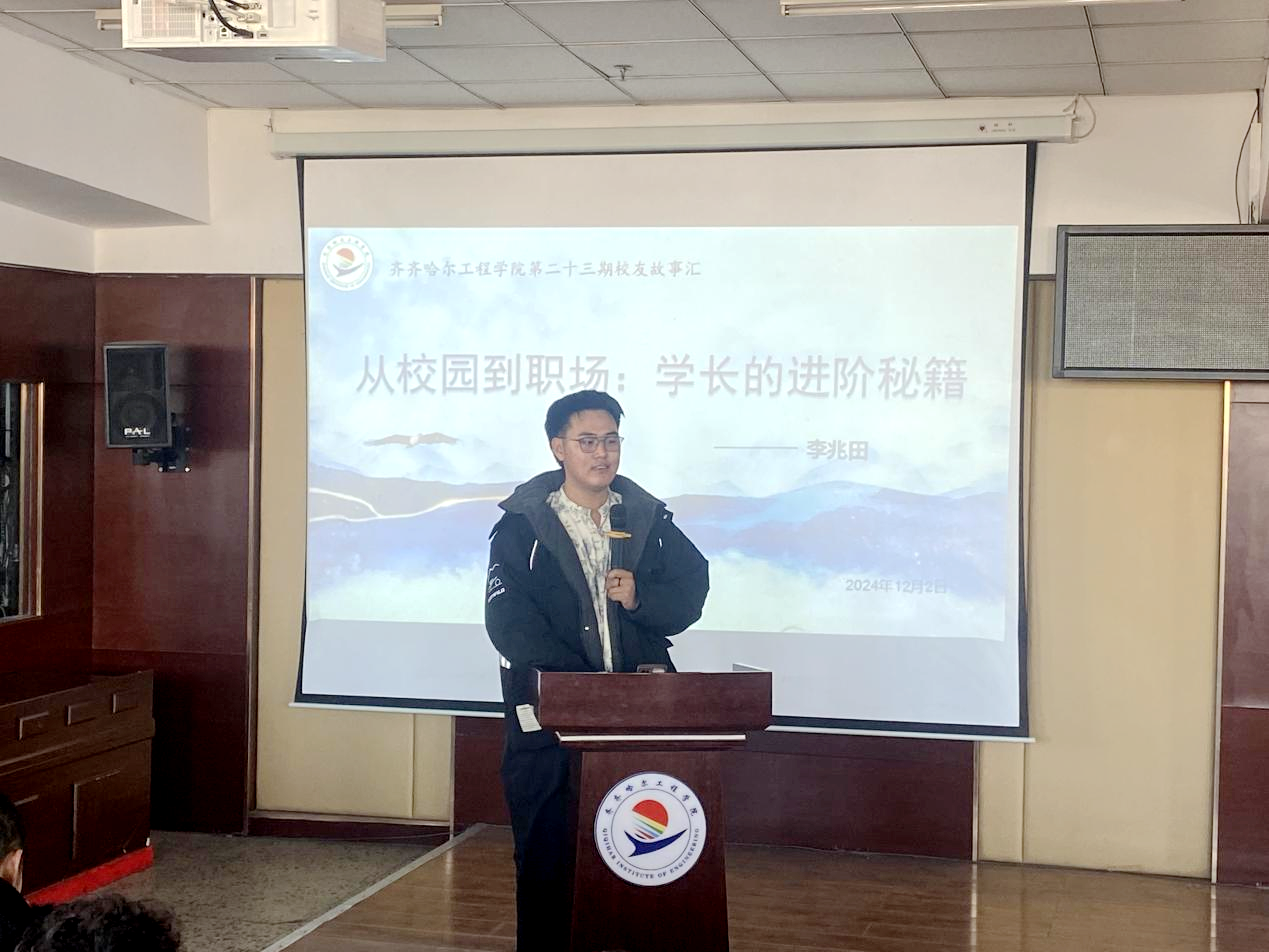 12月2日,在图书馆501会议室,学校举办第二十三期校友故事汇活动。建筑管理工程系土木工程专业邀请2024届优秀毕业生李兆田返校,为学校大三、大四学生作“从校园到职场——学长的进阶秘籍”交流分享,学生发展中心教师何龙主持。