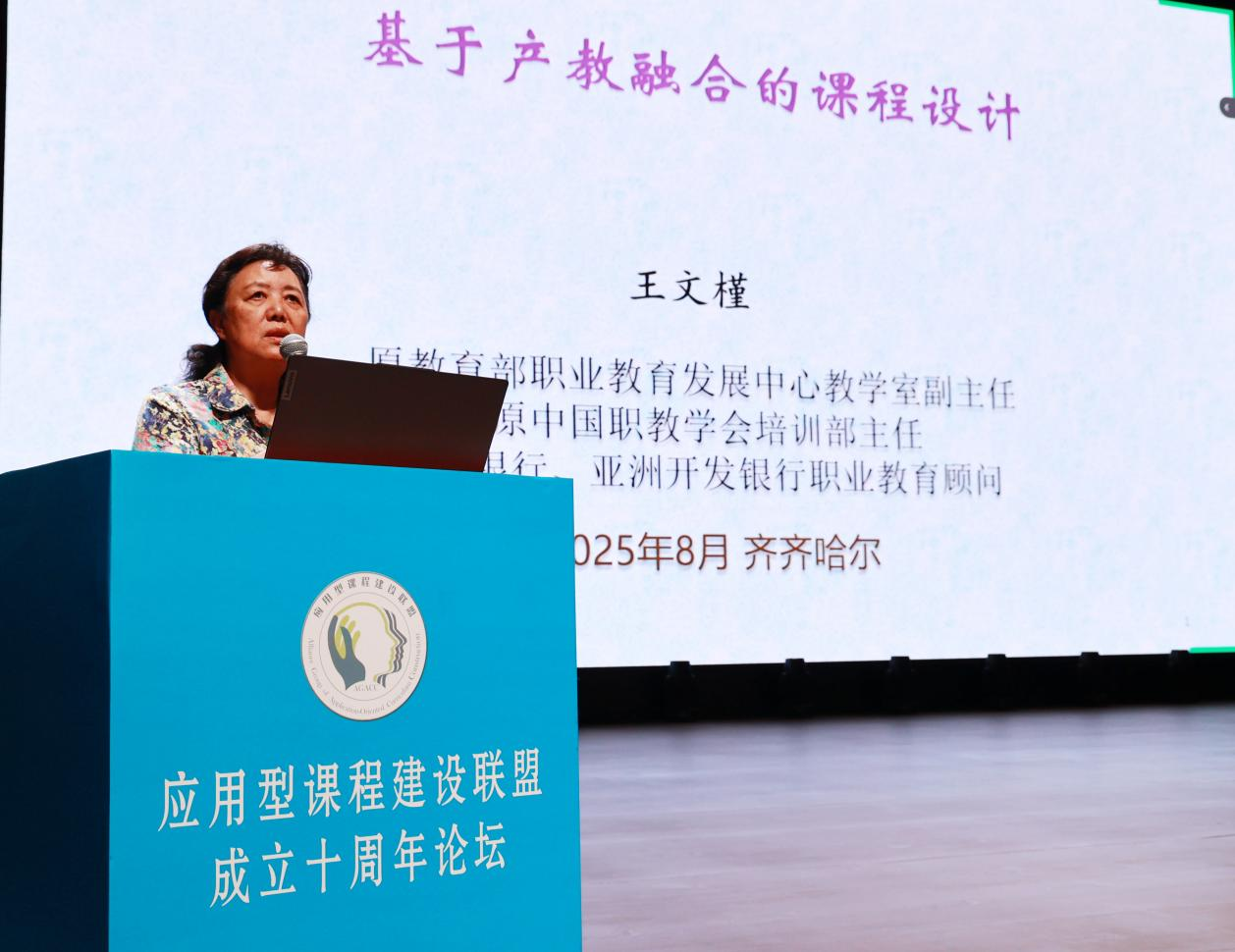 在主旨报告环节,应用型课程建设联盟理事长姜大源在云端以一首七律祝贺联盟成立十周年。随后,他以《关于课程与教育的几点反思》为题,系统阐述了课程与教育的关系。指出,课程始终是人才培养的核心要素,是保障教学质量的关键所在。强调,工作过程系统化的核心理念在于以促进就业为导向,以职业生涯发展为载体,最终实现人的全面发展。这一理念充分体现了应用型课程建设的内涵价值。