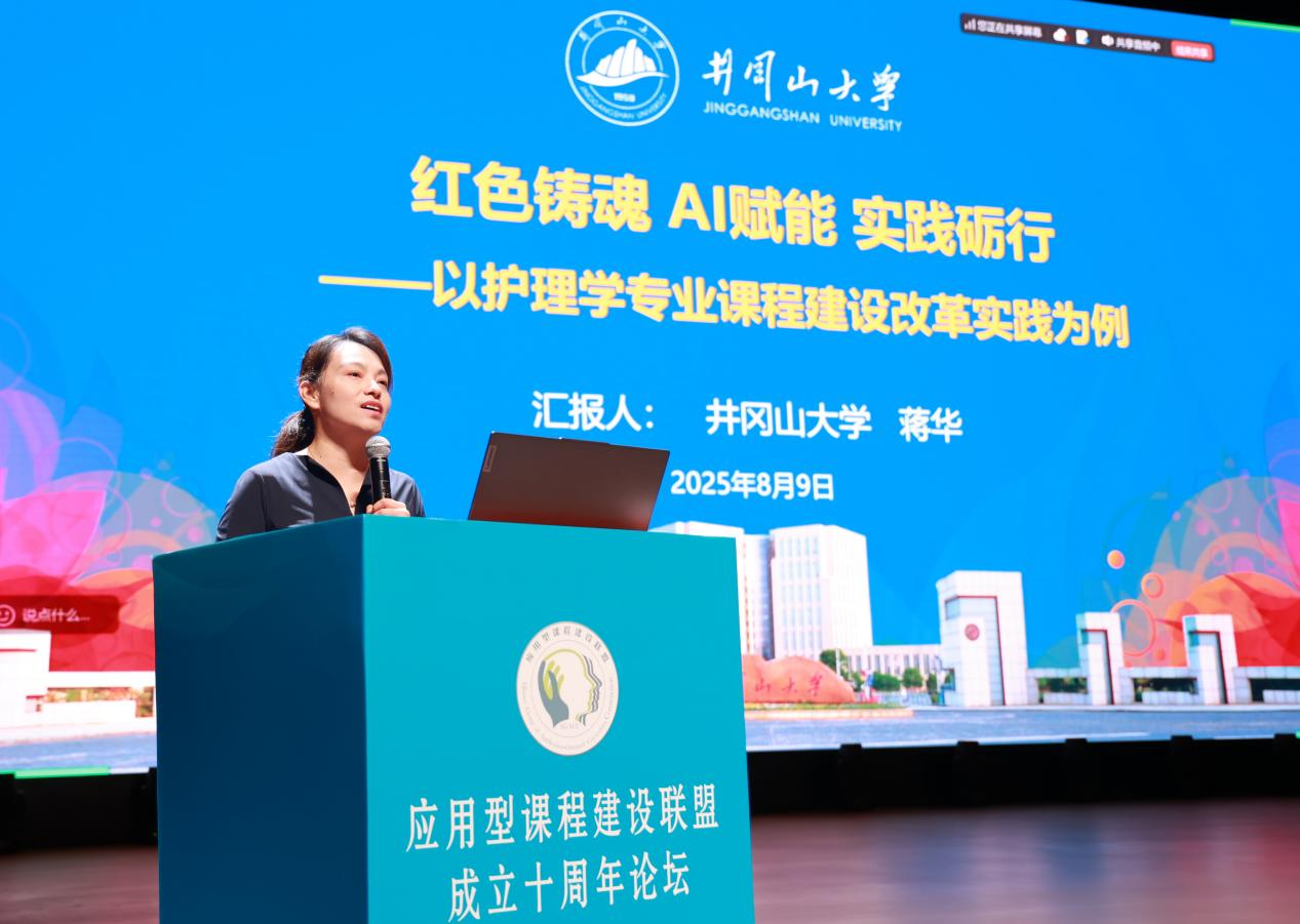 井冈山大学教师教学发展中心副主任蒋华作《红色铸魂,AI赋能,实践砺行——以护理学专业课程建设改革实践为例》报告。她表示,该校主要从三方面聚力建设课程。以红色铸魂,利用本地红色资源开设《井冈山精神教育》《红色卫生文化概论》等校本课程,挖掘思政元素并融入专业课程;借数智赋能,运用数字技术搭建课程教学资源库平台,引入智能教学工具,助力学生个性化学习;靠实践砺行,依托国家、省级实践实训平台,构建“训岗证赛创”实践实训模式,打造“行走的实践课堂”。