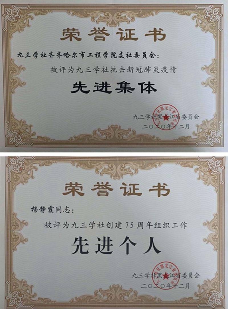 近日,伟德官网九三学社支社被九三学社黑龙江省委员会评为九三学社抗击新冠肺炎疫情先进集体,支社主委杨静霞同志被评为九三学社创建75周年组织工作先进个人。 【责任编辑 刘丽】
