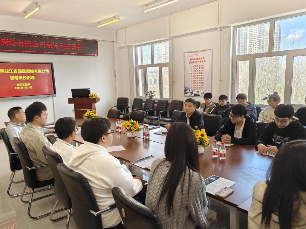 4月27日下午,建筑工程系与黑龙江国晟测绘有限公司总经理陆志伟一行两人在二号教学区2409会议室洽谈校企合作事宜。系党总支书记、负责人徐明,党总支副书记刘贤鹏、土木工程专业长钟美慧,专业助理、建筑产业学院副院长贺全德,辅导员刘子豪参加会议。徐明对陆志伟一行来校表示欢迎,并介绍了建筑工程系的专业设置、应用型人才培养、专业实践学期设置等情况。刘贤鹏从系历史沿革、学校2024届毕业生情况以及学生教育培养和学生实...