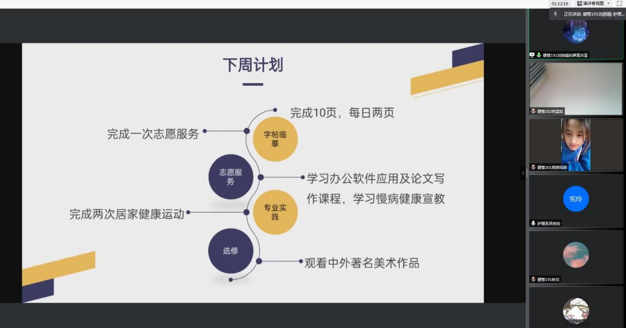 1月15日下午,健康与护理系的吴宪玲老师召开线上第四学期总结分享会,健康服务与管理专业HLX—225—233组全体同学参加。 首先,吴宪玲老师对小组成员本周的学习情况进行总结,随后,由各队长推荐优秀组员,陈...