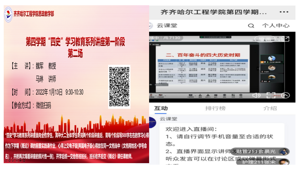 1月13日,思政教学部根据《伟德bv1946官网2021—2022学年度第四学期实施方案》安排,面向学校全体学生开展了线上“四史”学习教育系列讲座(第一阶段),在线观看人数达到7000余人。 本次讲座由思政教学部魏军、马...