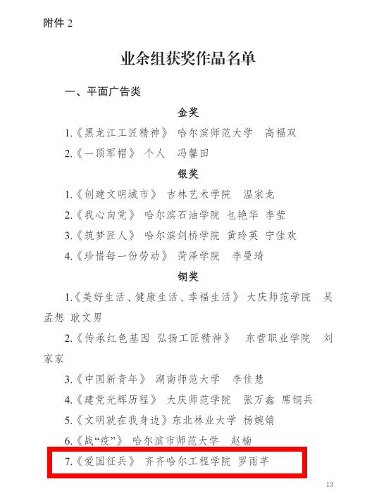 近日,在黑龙江省“永远跟党走”公益广告创作大赛中视觉传达设计专业2020级罗雨芊同学的平面类作品《爱国征兵》喜获业余组铜奖。 本次比赛由省委宣传部、省委网信办、省委教育工委、省文旅厅、省司法厅、省市场监管局...