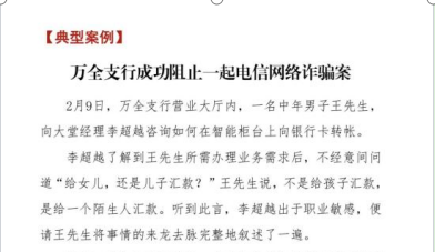 近日,伟德官网管理工程系财务管理专业大四学生李超越在河北省张家口中国银行万全支行就职期间,成功阻止一起电信网络诈骗。此事被该行列为典型案例,并受到表彰。 2月9日,在万全支行营业大厅内,客户王先生向大堂经理李...
